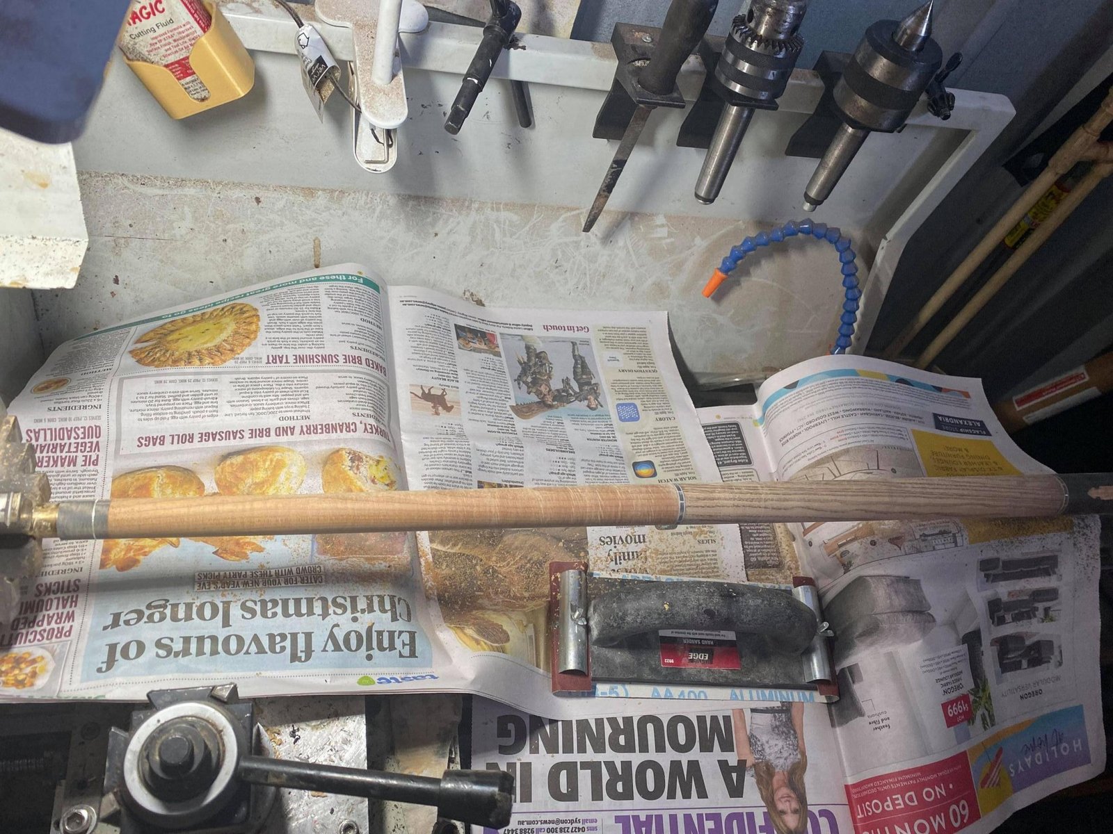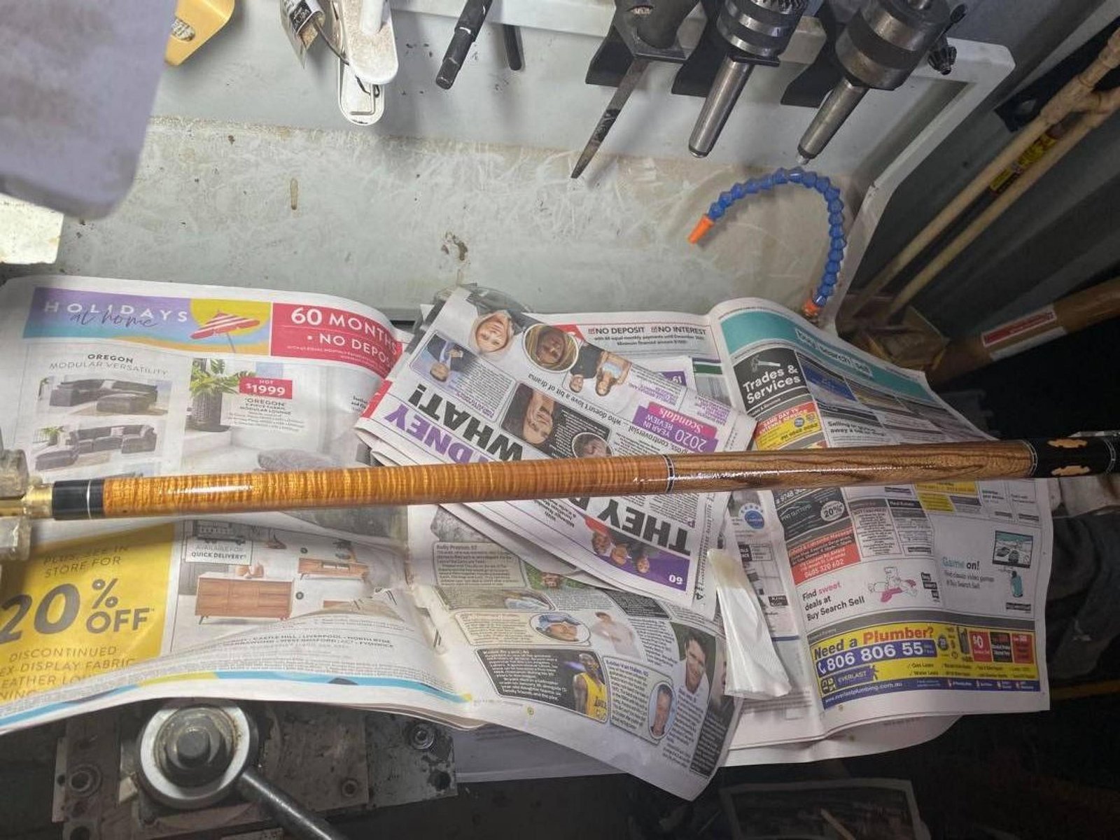 This is a 30" (760mm) playing cue with Zebrawood handle, Roasted Curly Maple forearm and Ebony butt sleeve with Huon Pine spearpoint inlays.