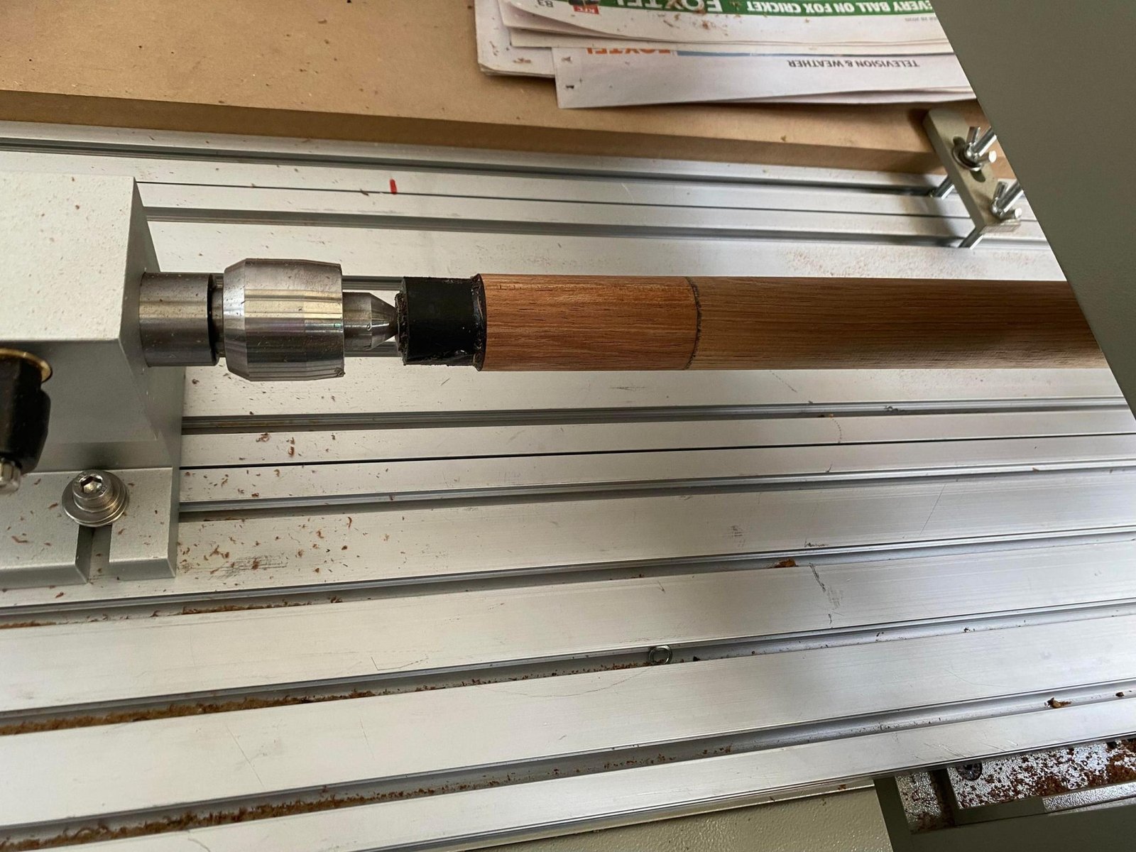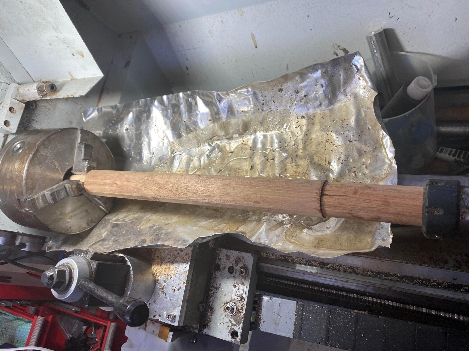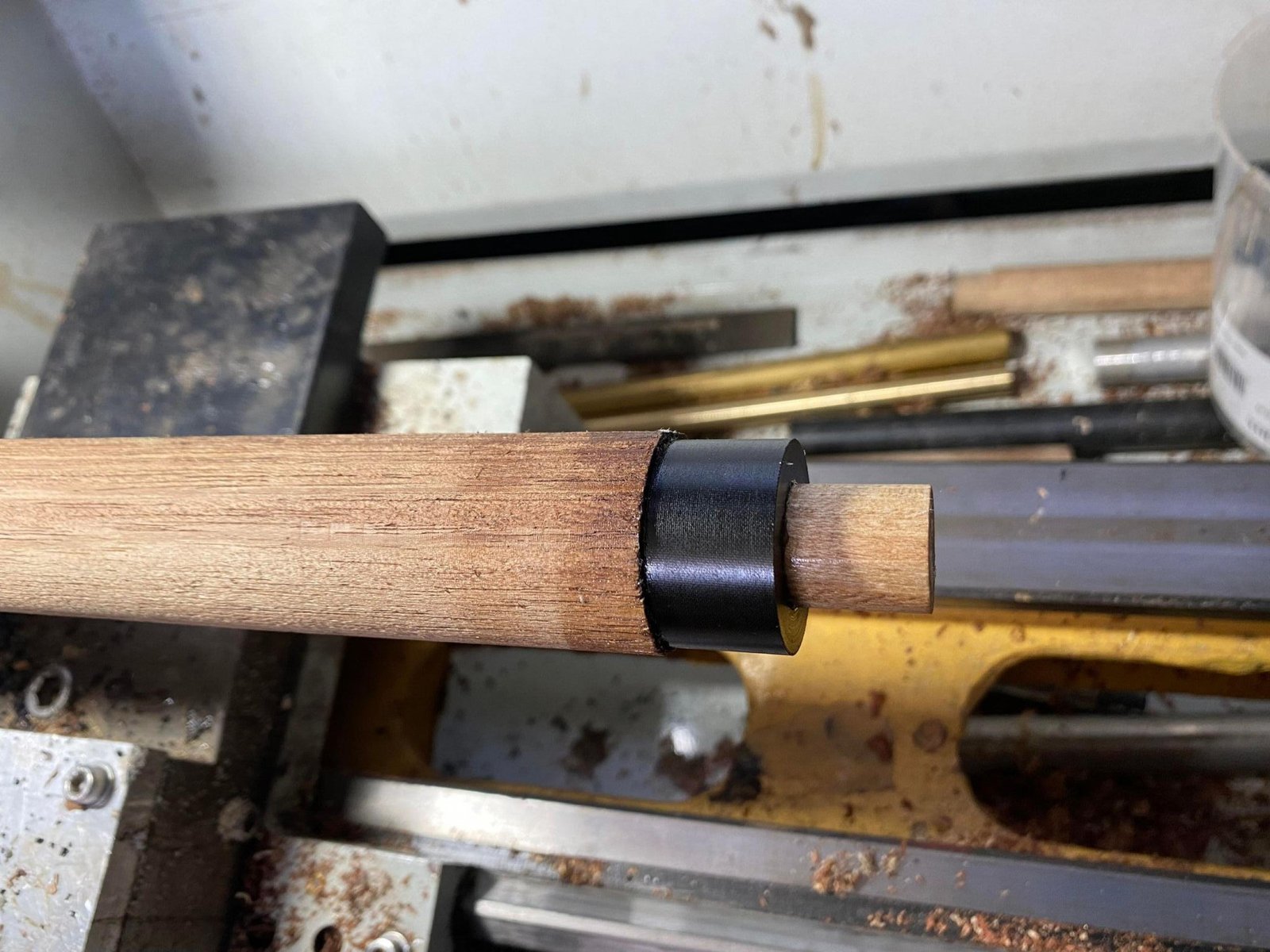 The laminated maple core was turned to size, glue relief grooves cut and the Tasmanian Blackwood pieces glued in place. Because it is only possible to drill about 350mm with a gun drill, 3 pieces will be combined.