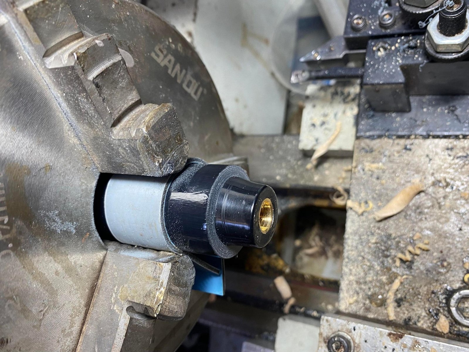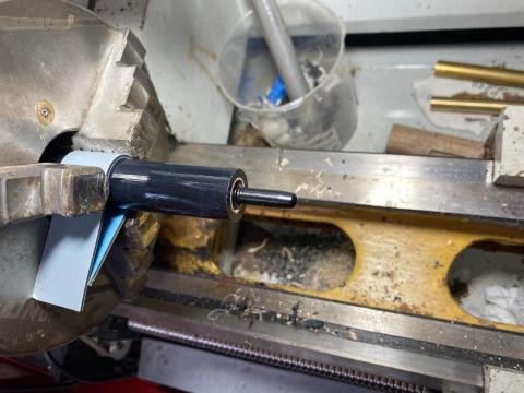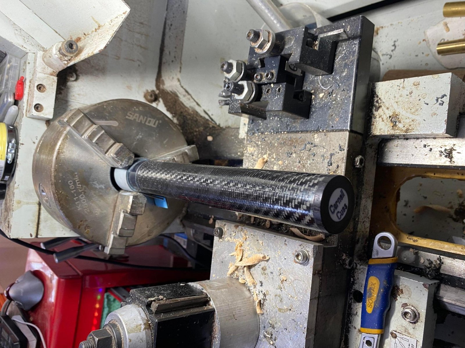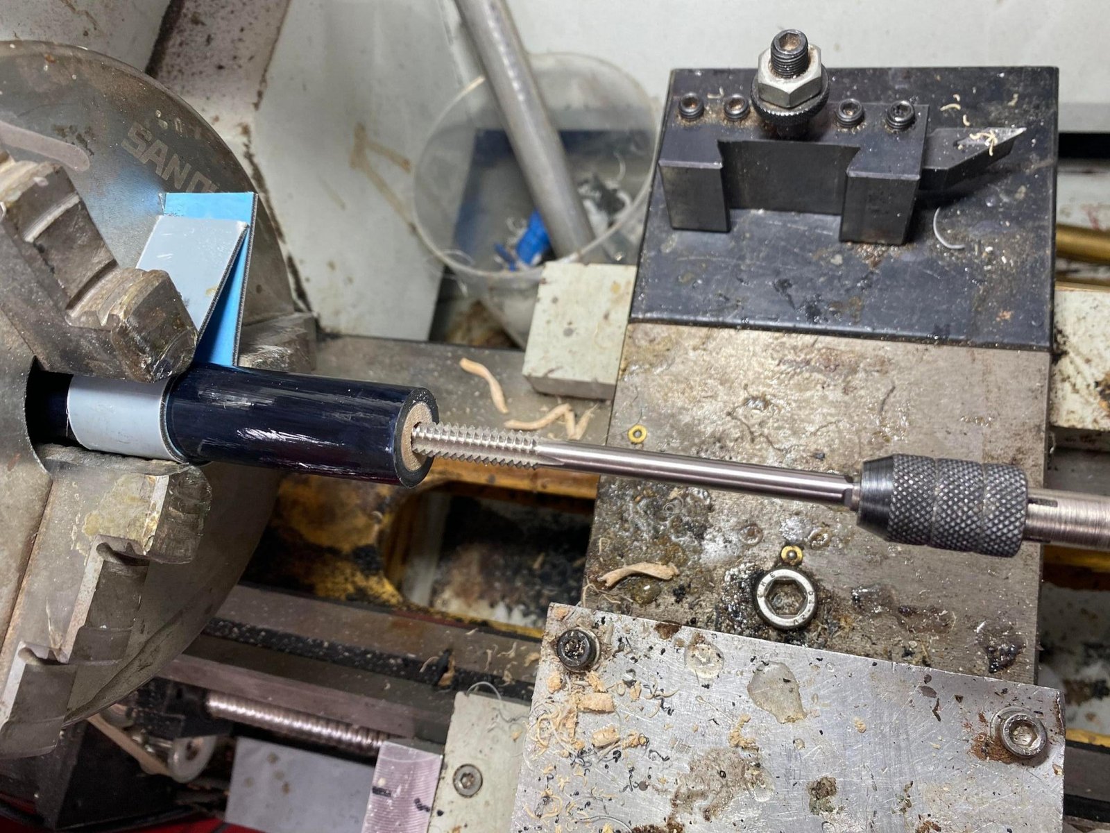 The laminated maple core was turned to size, glue relief grooves cut and the Tasmanian Blackwood pieces glued in place. Because it is only possible to drill about 350mm with a gun drill, 3 pieces will be combined.