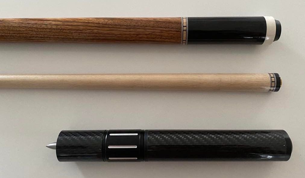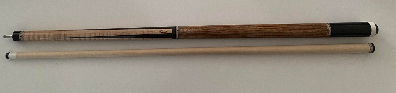 Was asked to make a wrapless cue with Ebony points. Forearm is Curly Maple and the Handle is Zebrano.