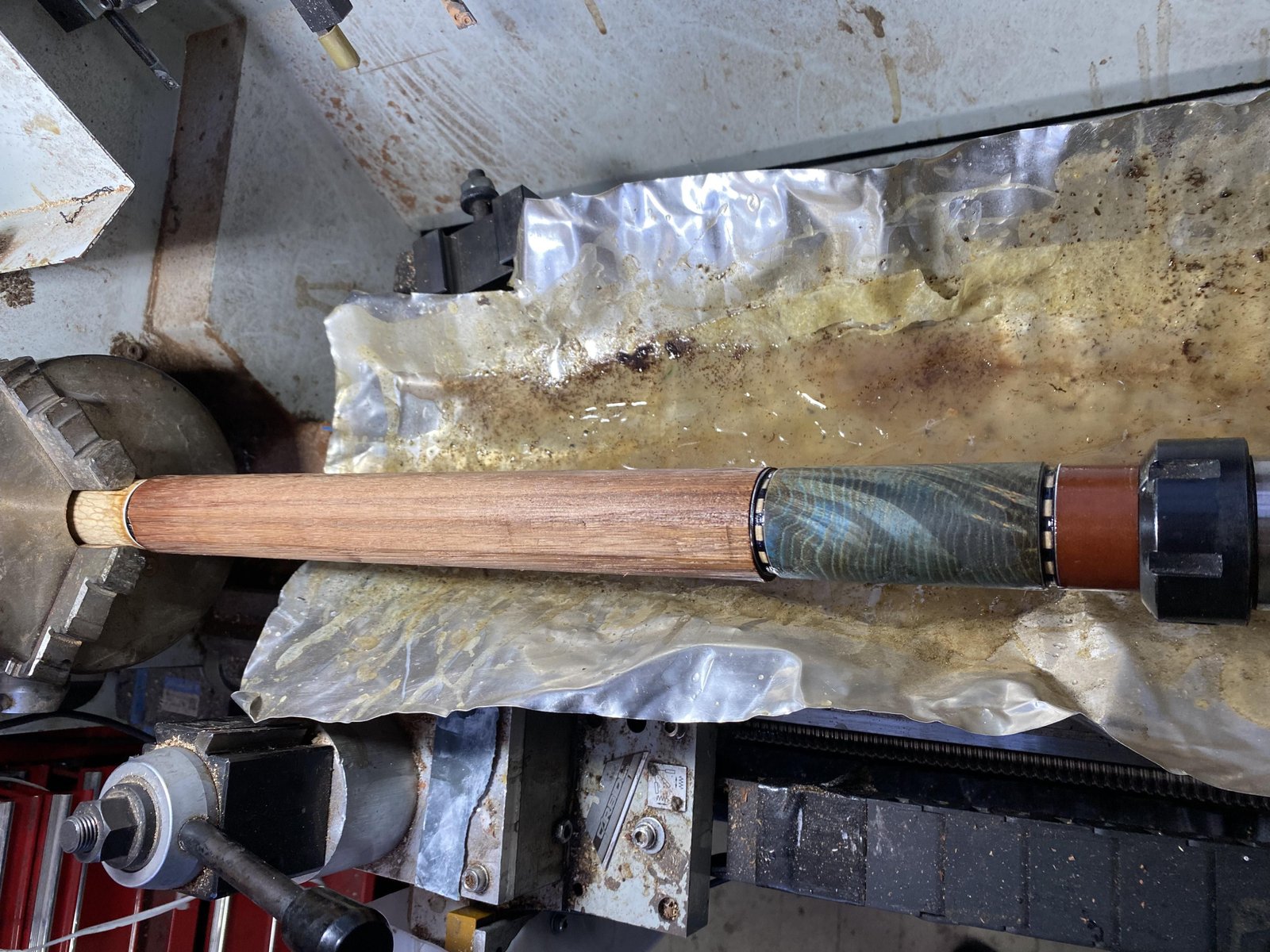 Forearm is Spalted Guava with an amazing spiderweb pattern. Handle is Red Zebrawood and the butt sleeve is a beautiful blue/green dyed Blackbutt.