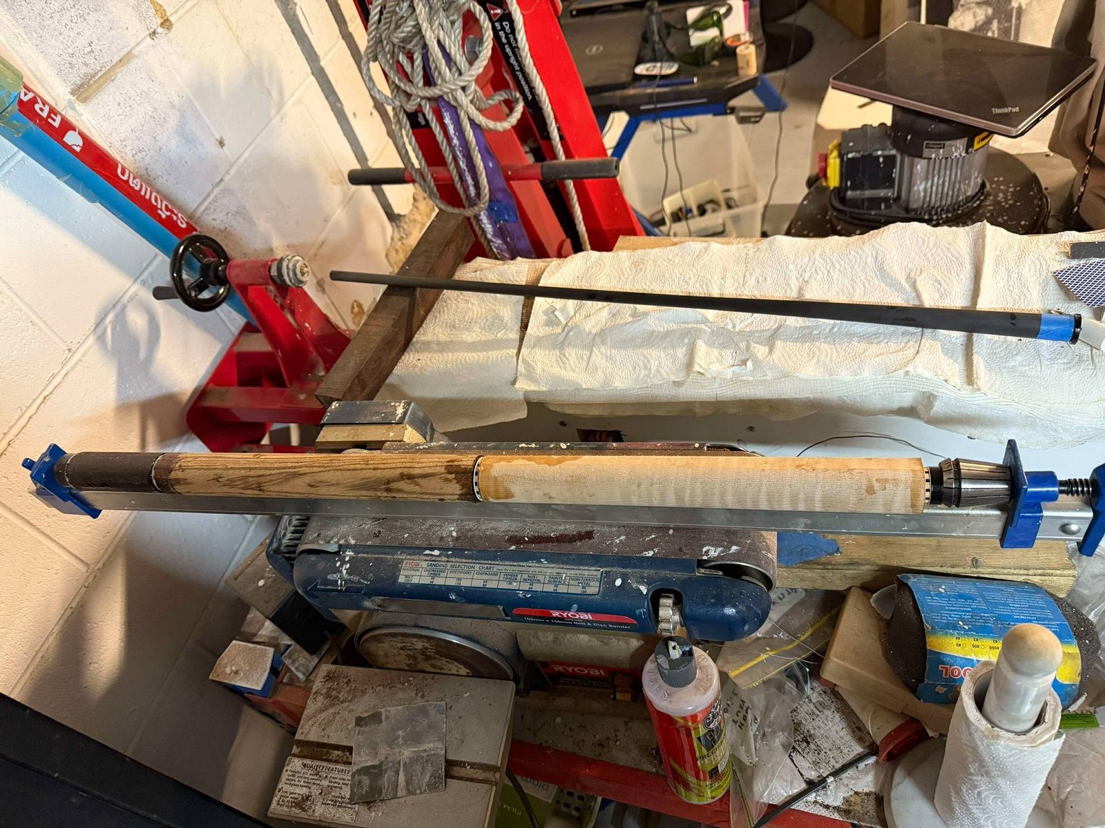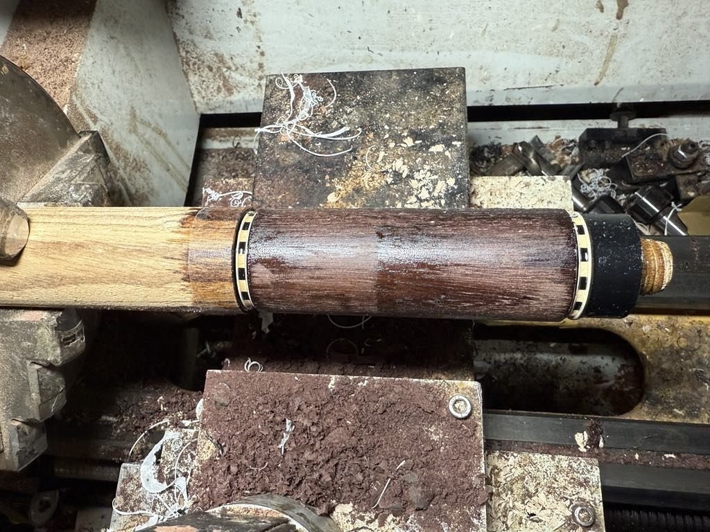 Zebrano handle, curly maple forearm and ebony butt sleeve.