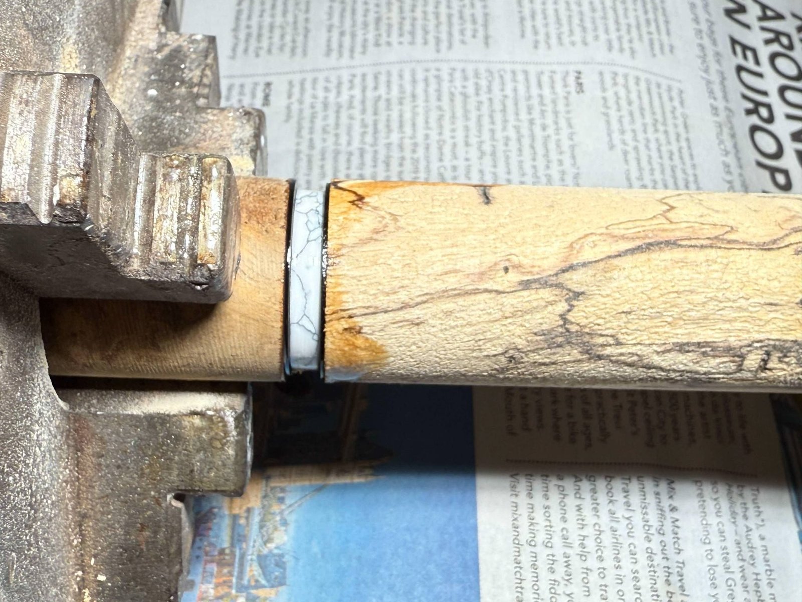 This is a playing cue with some interesting timber choices. There is a spalted tamarind forearm, amboyna burl handle and ebony butt sleeve.