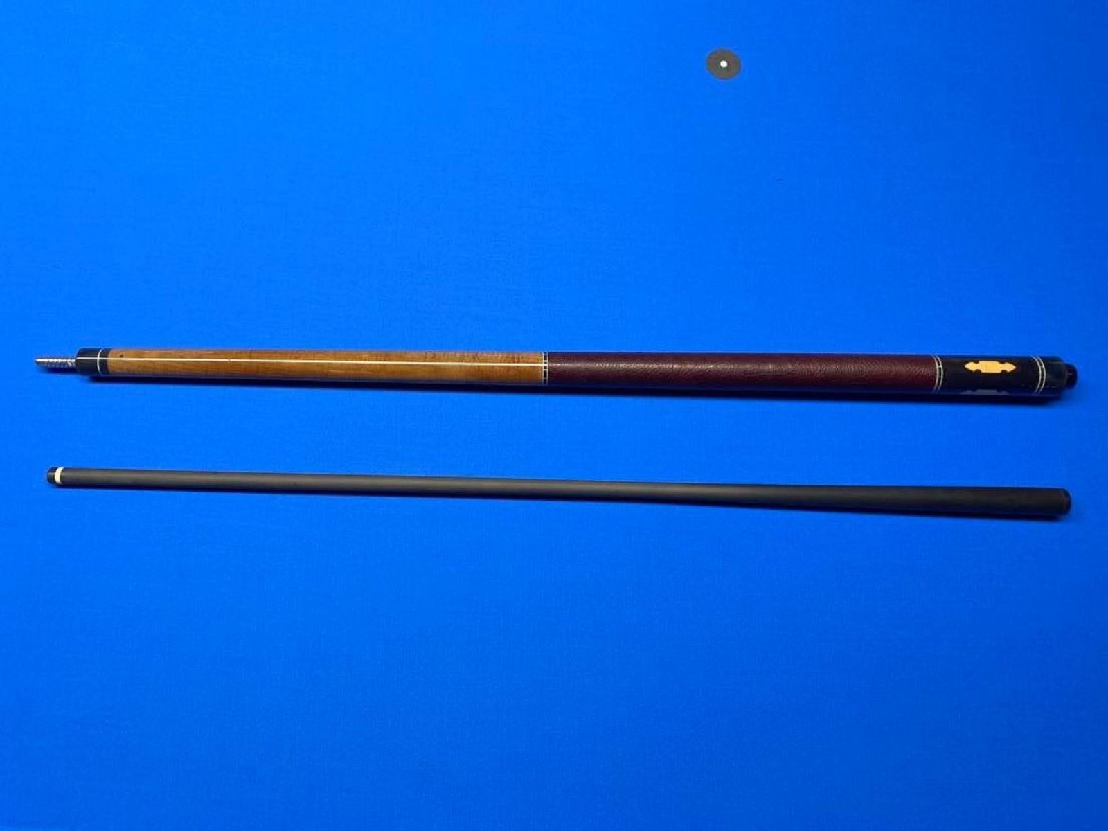 This is a 30" (760mm) playing cue with Zebrawood handle, Roasted Curly Maple forearm and Ebony butt sleeve with Huon Pine spearpoint inlays.
