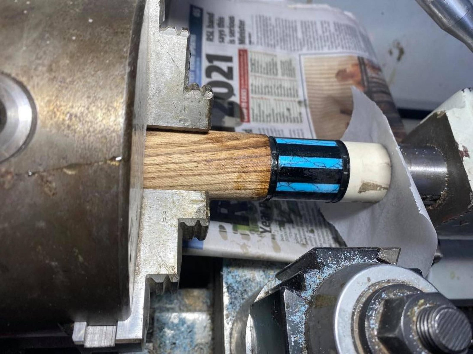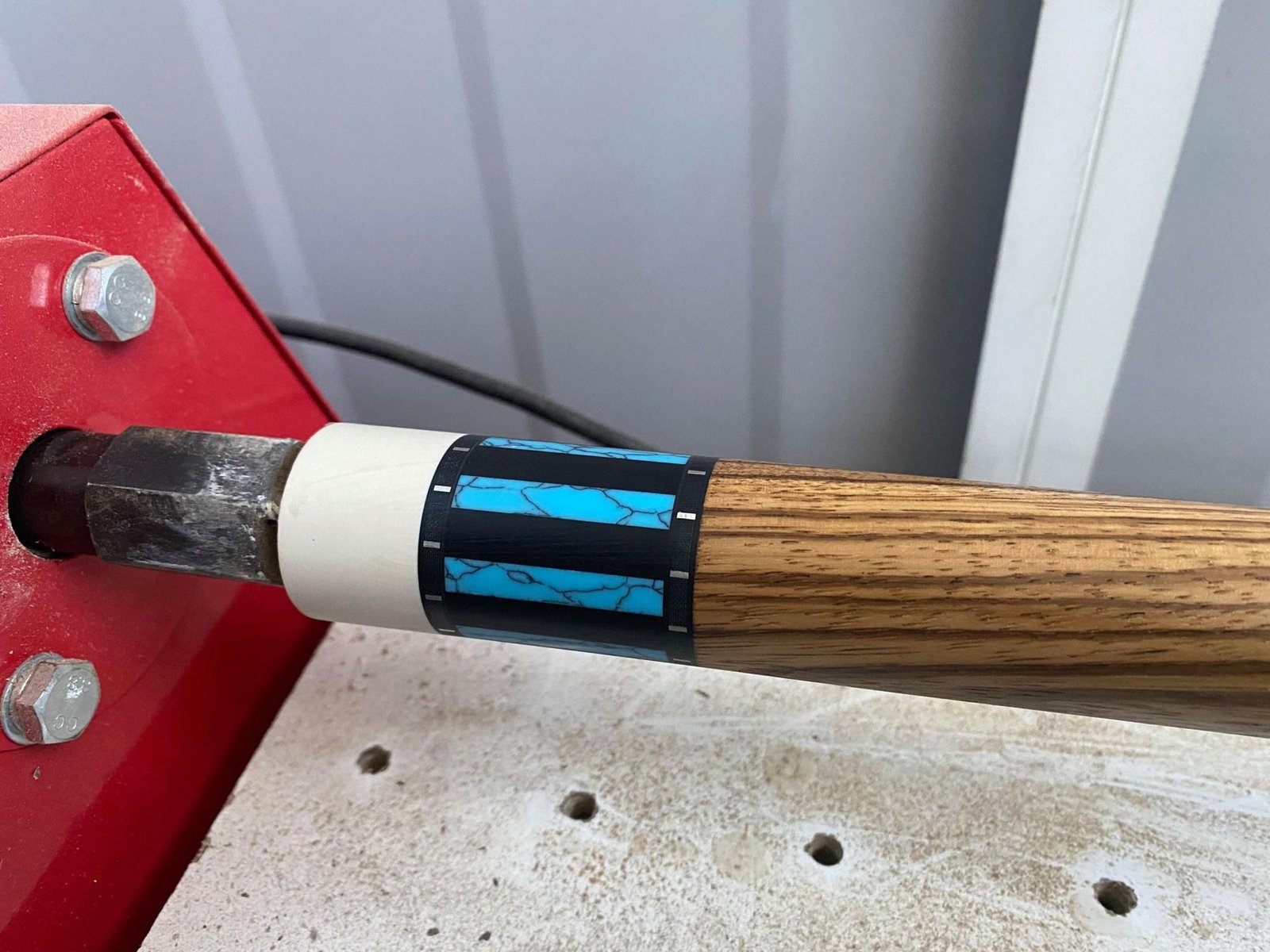 I started this one with the forearm first! Tasmanian Blackwood forearm with Victorian Mountain Ash inlay points. Laminated rock maple core inside Zebrano handle. Reconstituted stone inlays in the butt sleeve.