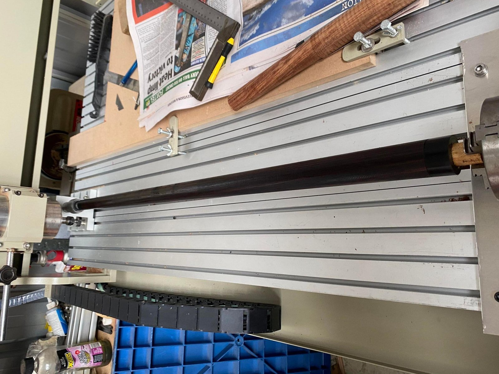 The laminated maple core was turned to size, glue relief grooves cut and the Tasmanian Blackwood pieces glued in place. Because it is only possible to drill about 350mm with a gun drill, 3 pieces will be combined.