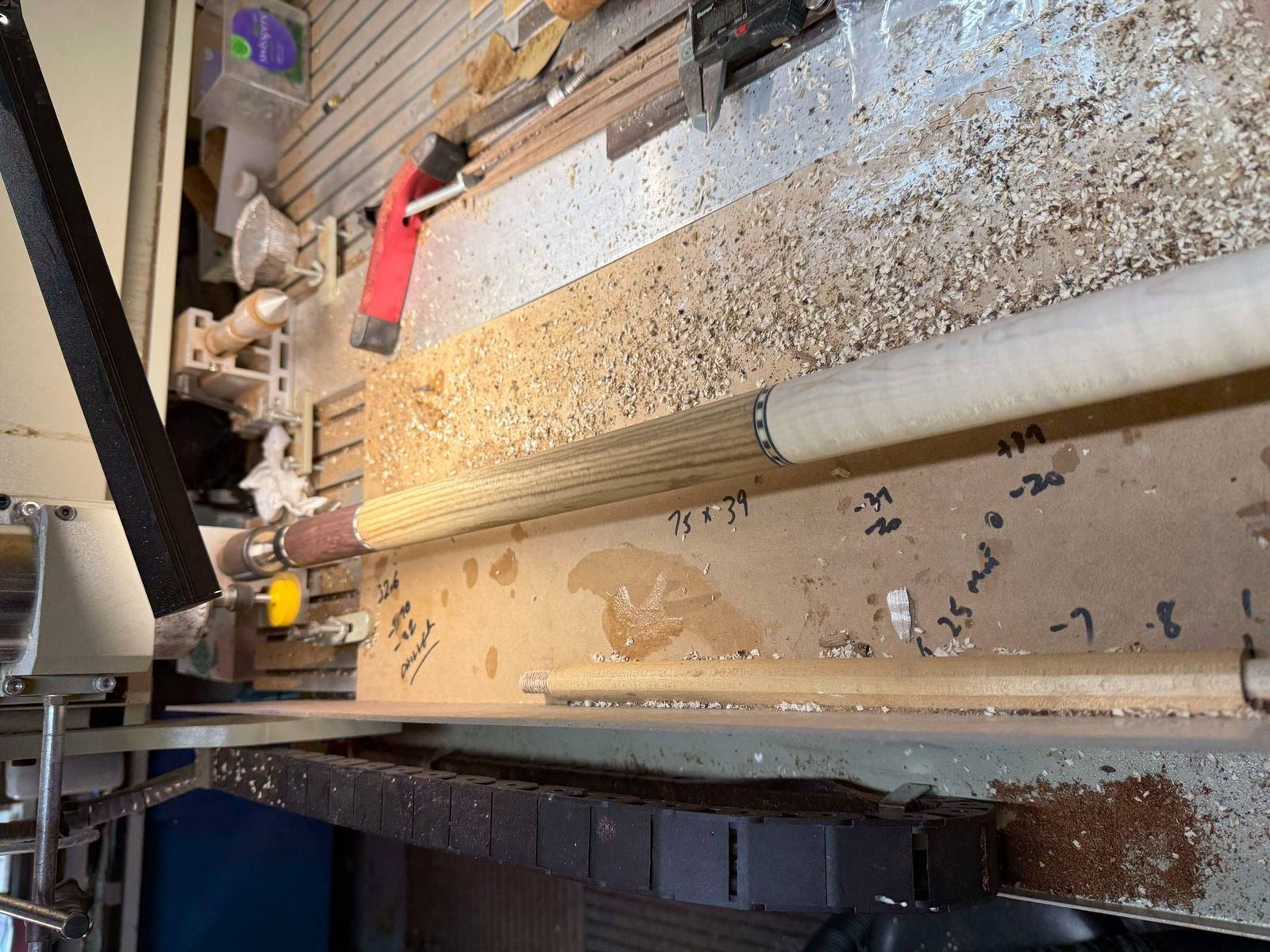 Zebrano handle, curly maple forearm and ebony butt sleeve.